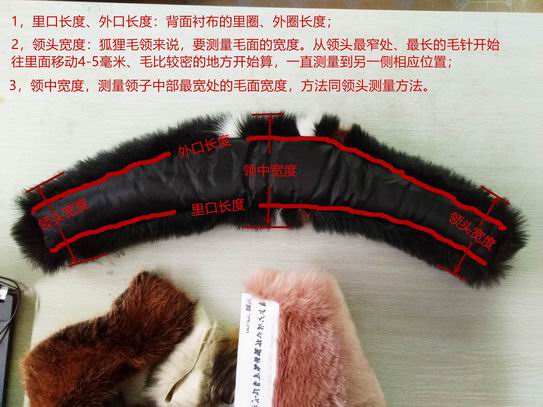 首先是狐狸毛领,狐狸毛领的毛面特点是绒毛密实,针毛稍长,绒毛和针毛界限不明显,所以测量狐狸毛领的宽度,我们一般测量毛锋宽度。就是毛领两侧的个别的长针毛不算,从比较密实的针毛开始算起的两侧的宽度。